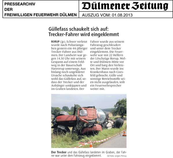 2013-08-01: Güllefass schaukelt sich auf: Fahrer eingeklemmt